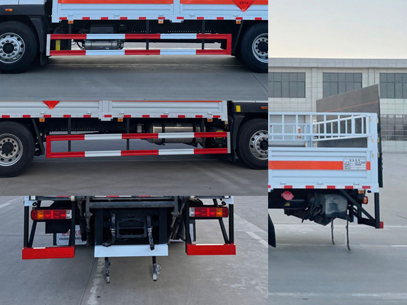 其它:1、該車適用于運輸危險品。運輸具有獨立容器(瓶)包裝的物品,類項號:2.1,2.2。2、側,后防護材料均為Q235,側防護螺栓連接;后防護焊接,截面尺寸120×50mm,下邊緣離地高490mm。選裝后部無尾板時,后防護材料為Q235,焊接,截面尺寸120×50mm,下邊緣離地高490mm。選裝欄板樣式。3、僅采用軸距(mm):4700,5150。隨底盤選裝駕駛室,選裝電瓶、尿素罐、儲氣筒、后處理位置。僅選用排氣管前置、限速裝置(限速80km/h)、前輪盤式制動及子午線輪胎的底盤;安裝帶有衛星定位功能的行駛記錄儀。該車轉向輪安裝輪胎爆胎應急防護裝置,后軸采用空氣懸架。選裝ETC。EBS系統型號/生產廠家:EBS 5/克諾爾制動系統(大連)有限公司,CM-EBS/廣州瑞立科密汽車電子股份有限公司。采用的發動機與油耗值(L/100Km)對應關系為:F4.5NS6B220/24.4,B6.2NS6B210/26。尾板收起狀態水平長度為290mm,尾板質量550kg。