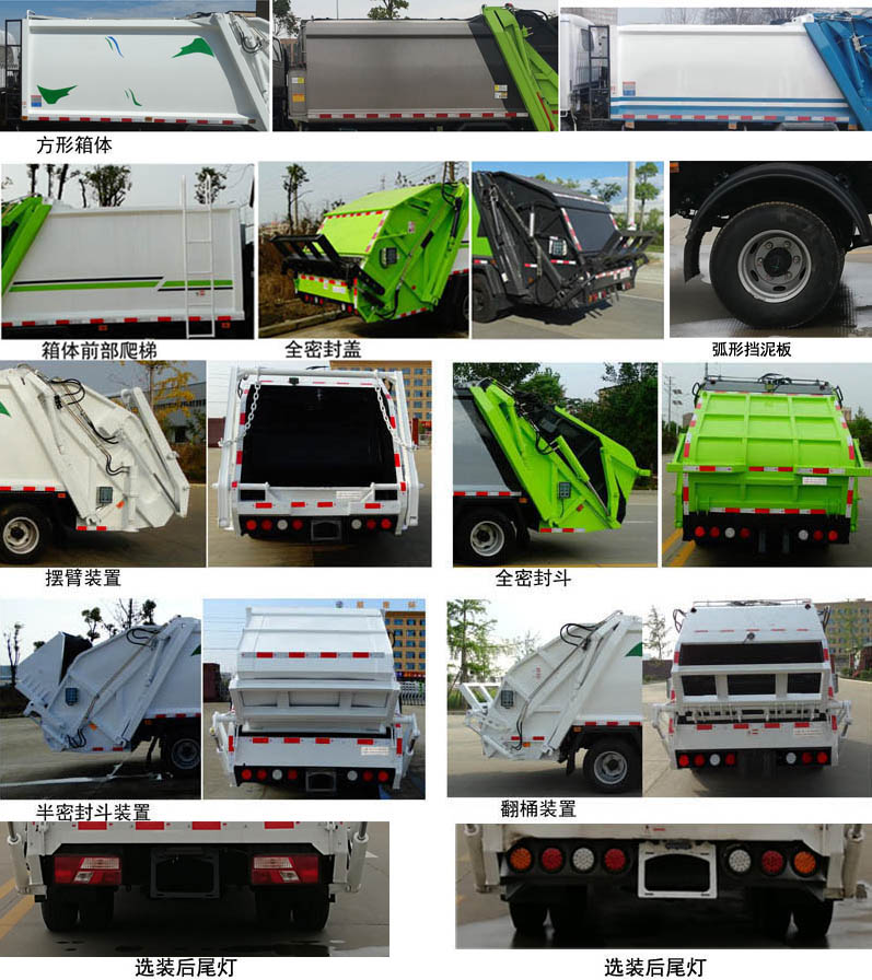 配置  1、該車主要專用裝置由箱體、壓縮系統(tǒng)組成,用于垃圾的收集與清運(yùn)。該車可選裝方形或弧形箱體,選裝全密封蓋裝置,選裝弧形擋泥板,選裝箱體前部爬梯,選裝后部工作裝置。選裝工作裝置時(shí),外形長(zhǎng)(mm)/后伸(mm)/整備質(zhì)量(kg)對(duì)應(yīng)關(guān)系:①無上料裝置: 6570/-/5830;②擺臂裝置: 6730/160/6100;③全密封斗裝置: 6770/200/6100;④翻桶裝置,半密封斗裝置:6970/400/6100。2、側(cè)防護(hù)采用冷彎型鋼/Q235,螺栓連接;后防護(hù)由專用裝置替代,下邊緣離地高500mm。3、隨底盤選裝黑色輪輞。ABS系統(tǒng)型號(hào): VIE ABS-II,ABS系統(tǒng)生產(chǎn)廠家: 浙江萬安科技股份有限公司。發(fā)動(dòng)機(jī)JX4D306H的油耗值為14.5L/100km。
