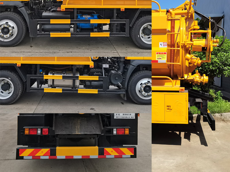 其它:該車用于下水道疏通清洗及吸污并具有舉升功能,主要專用裝置:罐體和清洗吸污裝置.污水罐外形尺寸(總長×直徑)(mm):4600×1600,污水罐總?cè)萘?.5立方米,有效容積8.13立方米;罐體兩側(cè)為水箱,截面由圓弧及多邊行組成,外形長為4000mm,清水罐總?cè)萘?.9立方米,有效容積3.88立方米;清水罐和污水罐為獨立罐體,清洗、吸污兩種功能不能同時使用,兩個罐體不能同時滿載.側(cè)、后防護材料均采用Q235,側(cè)防護螺栓連接,后防護焊接,后防護截面尺寸(mm):200×60,離地高420mm.ABS型號/廠家:CM3XL-4S/3M(4SF)/廣州瑞立科密汽車電子股份有限公司,XH-KQ4S3M-E01/廣州市西合汽車電子裝備有限公司.僅選用3900mm軸距底盤,隨底盤選裝駕駛室.
